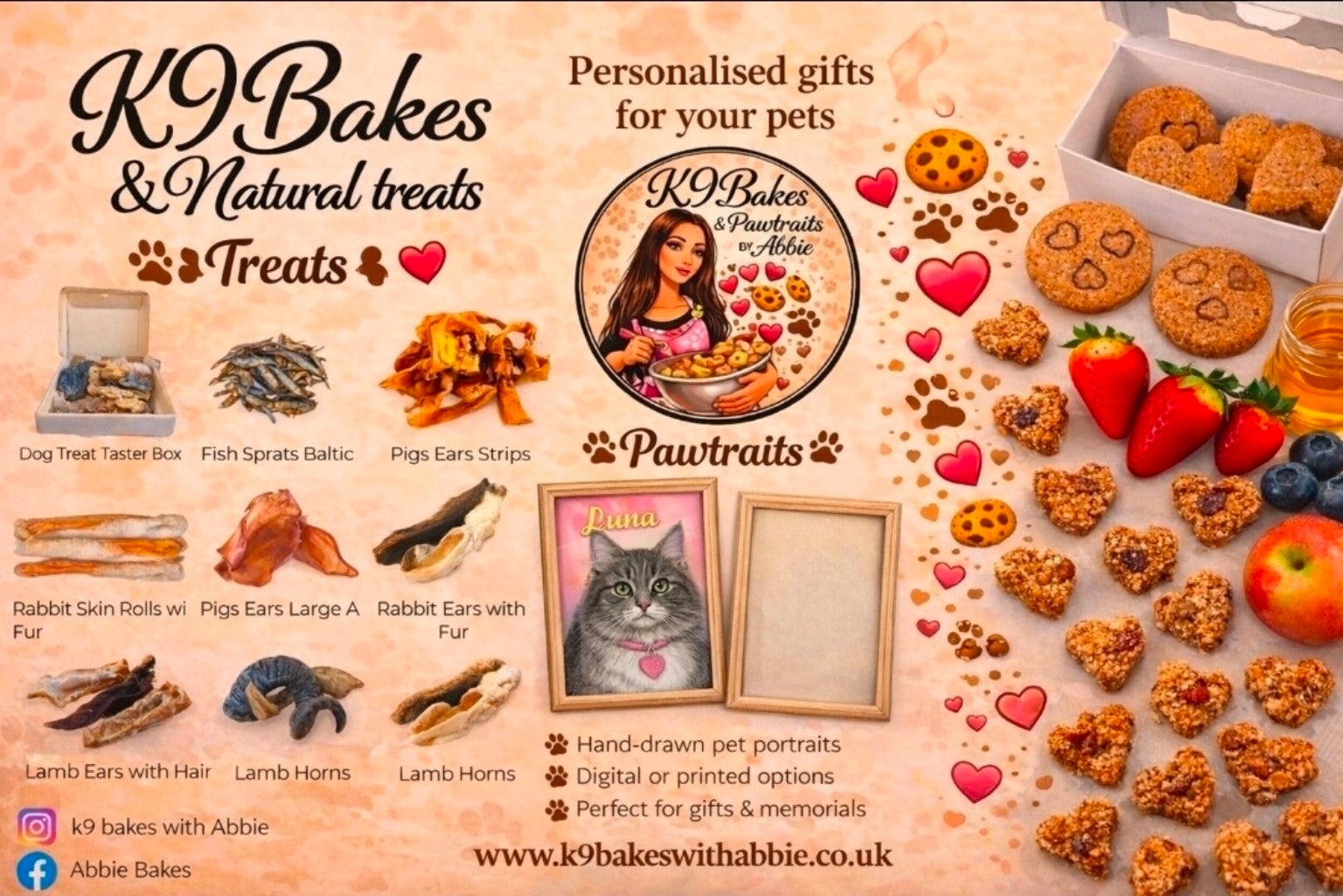 Discover the irresistible homemade goodness and natural chews from k9 bakes & Pawtraits with abbie, crafted with love for your furry companion. We're dedicated to providing the best for your dog's health and happiness.